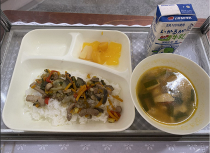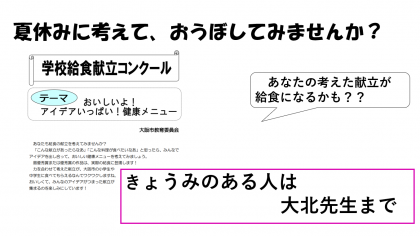 今日の献立は、学校給食献立コンクールの優秀賞作品です。平野西小学校の小学生が考えたメニューです。皆さんも応募してみませんか?考えたメニューが来年の給食になるかもしれません。