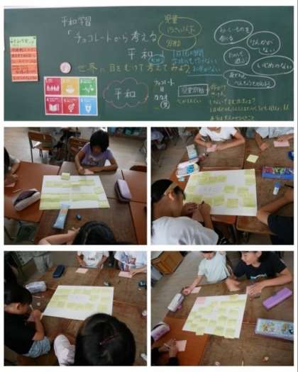 3年生は、平和学習でSDGsの到達目標をもとにして、世界に目を向けて、「平和」についてグループごとに考えを出し合いました。