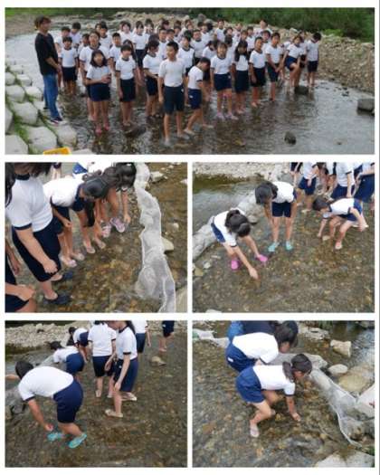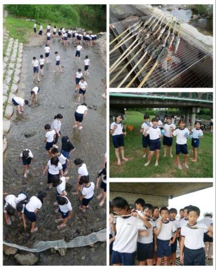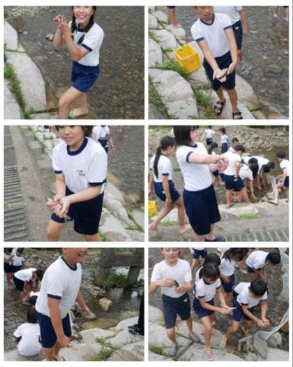 昼食後は、川へ魚つかみに行きました。最初は怖がっていた人も、夢中になって魚を追いかけてました。捕まえた魚は、もちろん美味しくいただきました。