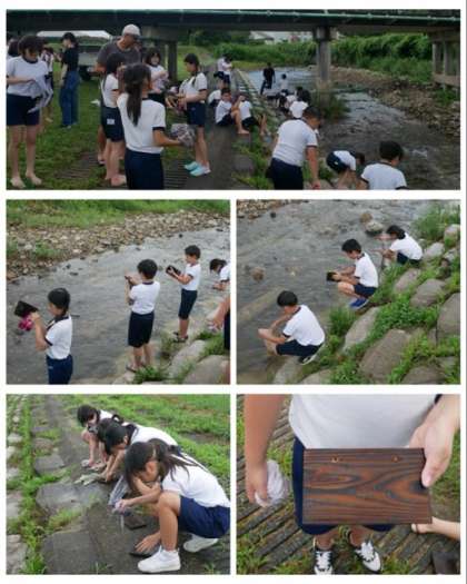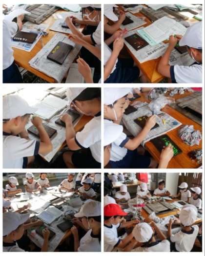焼き板を川辺で磨いた焼き板を宿舎のテラスでペイントしました。