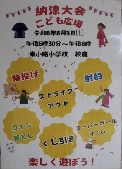 明日の8月3日(土)の午後5時30分から8時まで、東小路小学校の運動場で、地域行事の納涼大会が開催されます。