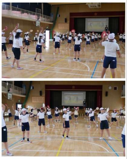 5年生は、体育科で運動会で披露するエイサーの表現運動に取り組んでいます。