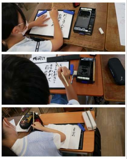 5年生は、国語科の書写の学習で、小筆を使って夏の思い出を短歌にして半紙に書きました。