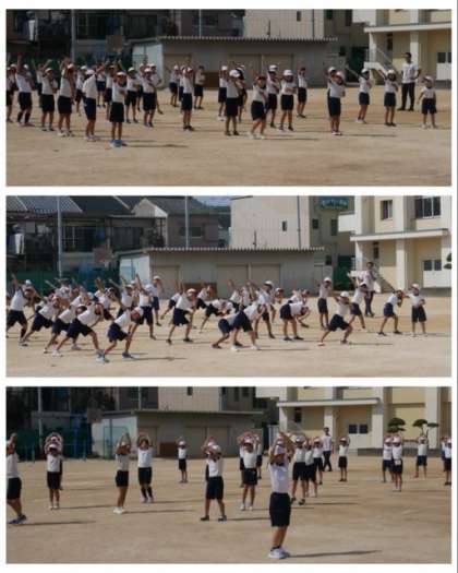 3年生は、運動場に出て、運動会の団体演技の練習をしました。2025万博のテーマソングに合わせてキビキビと動いていました。