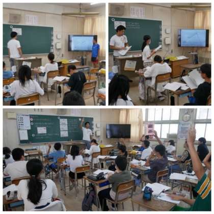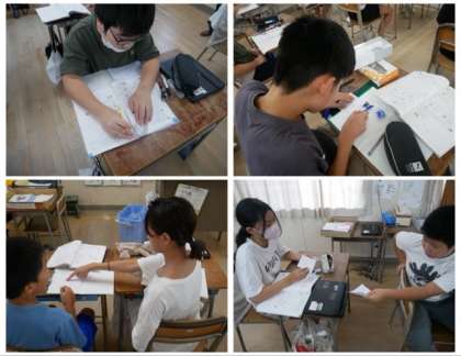 6年生は、算数科の学習で元の三角形の二倍の大きさの拡大図を作図するには、どこを測ればいいのか、辺の長さや角の大きさをどのようにすればいいのか考えました。