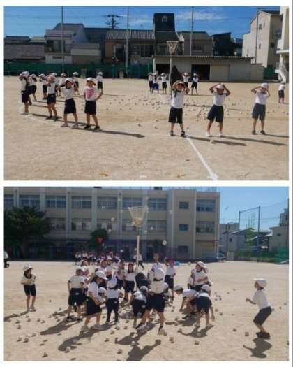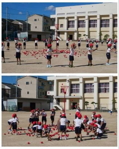 1年生は、運動会の団体競技で行う玉入れの練習をしました。「チェッコリ」のダンスの曲が鳴り止むのを合図にかごに玉を入れていきます。