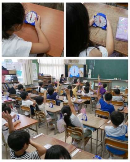 1年生は、算数科で時計の学習をしました。実際に時計を操作しながら、長針と短針の意味を知り、起きる時刻の6時に時計の針を合わせることができました。