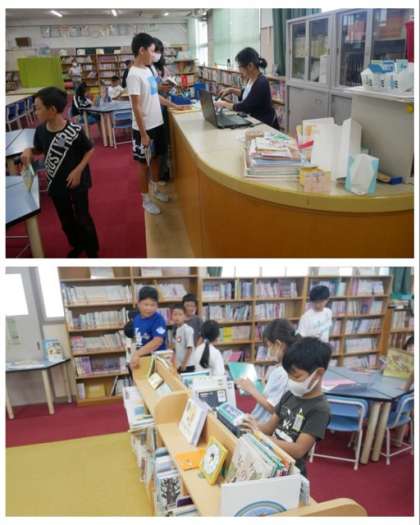 図書館司書が在中している業間休みや、お昼休みは図書館を開放しています。今日は、特に雨だったのでたくさんの人が図書館を訪れて本に親しみました。