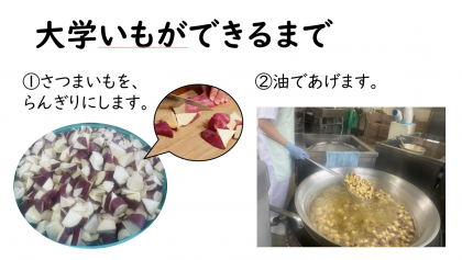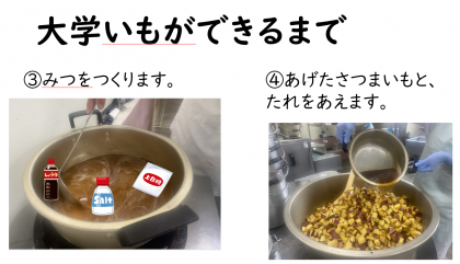 秋の味覚さつまいもが登場しました。乱切りにしたさつまいもを、油で揚げて、甘いたれをかけます。外はパリっ、中はホクホクでとてもおいしかったですね。