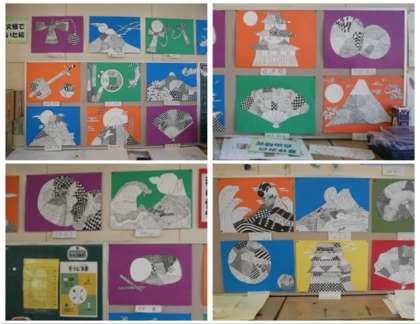 運動会で踊ったエイサーの場面を描き表したり、日本の伝統模様を細かく描いたり、自分らしさを表現しています。