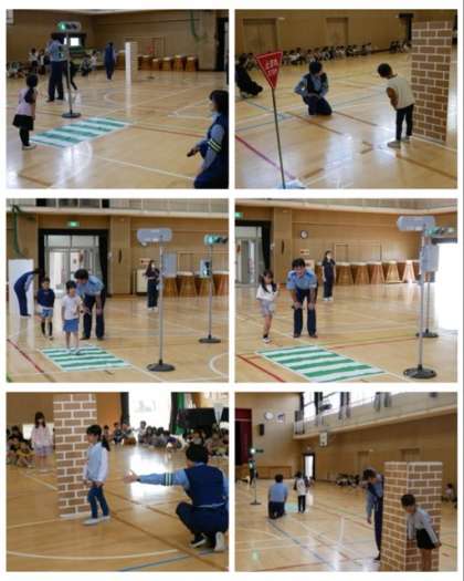 1年生と2年生の低学年は、標識や信号の間違い当てクイズをしたあと、体育館に設置された交差点や、見通しの悪い道を実際に一人一人交通ルールを守りながら歩きました。