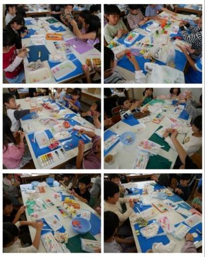 1年生は、作品展に向けて立体作品の作成にかかりました。今日は、図工室に移動して1組2組合同で作品に取り組んでいました。