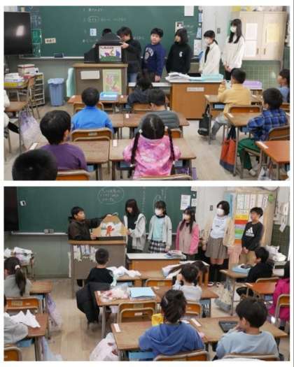 図書委員会の人たちは、朝の会の時間に1年生の教室へ行き、紙芝居をしました。1年生は、一生懸命にお話を聞いていました。