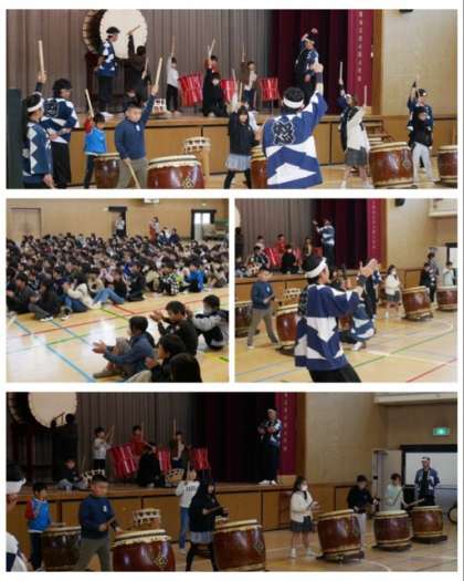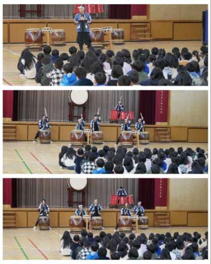 今年の芸術鑑賞会は、和太鼓集団「怒」の方に来ていただき、力強い和太鼓の演奏を披露していただきました。また、各クラスの代表の人たちが和太鼓体験をし、他の人たちも手拍子で盛り上げました。