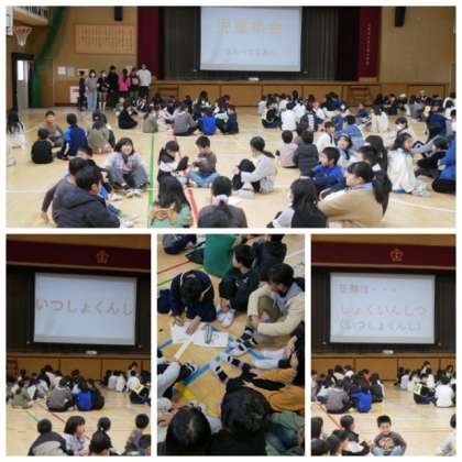今日の児童集会は、「ならべてなあに」クイズでした。スクリーンの言葉を並べ替えて言葉を作ります。わかった人は、思わず大きな声で答えを言ってしまってました。