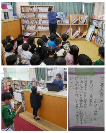 1年生は、図書の時間に学校図書館司書から絵本の読み聞かせをしてもらったり、貸し出しの受付をしてもらったりしました。