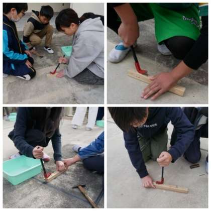 6年生は、理科のてこのはたらきの学習で、板に打ちつけたくぎをくぎ抜きで抜く体験をしました。どのようにしたら、あまり力を入れずに抜けるか確かめました。