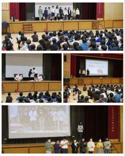 学校保健委員会で、健康委員会の人たちが劇や、歌、クイズで、石けんを使って手を洗おうと呼びかけました。発表後には、歯科校医の林先生から講評をいただき、児童や保護者の方からも感想を発表していただきました。