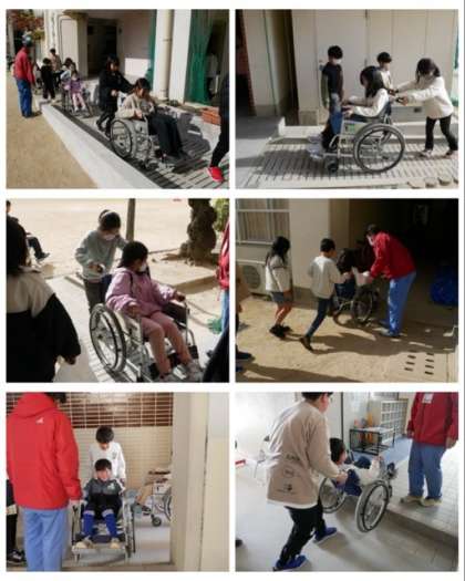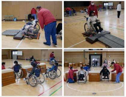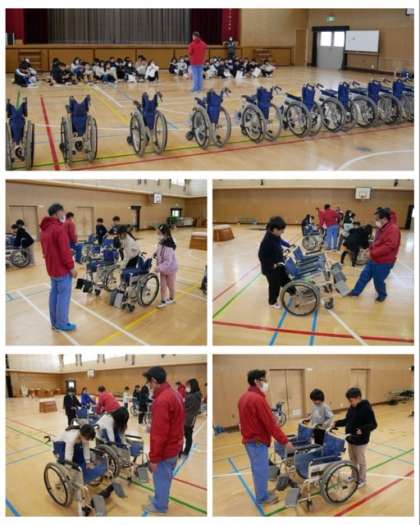 まずは、体育館で自分で車椅子を操作しながら進む体験をしました。スロープや狭いところ、段差などを車椅子を自分で操作しながら進みました。後半は、グループになって車椅子に乗る人と押す人に分かれて、どちらの立場の人のことも体感することができました。