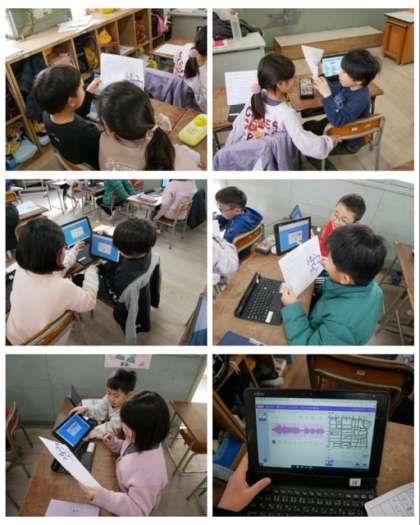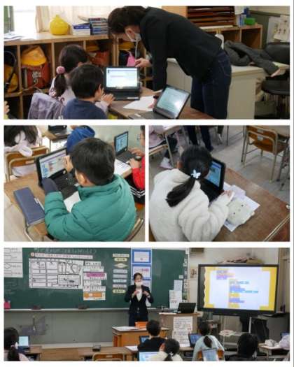2年生は、国語科の学習として、一人一台学習者端末を使って、お店の紹介プレゼンテーションのナレーションを録音するプログラミングをしました。