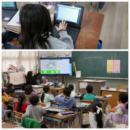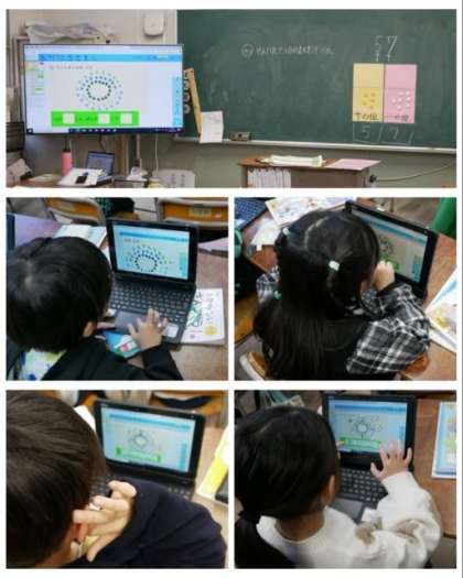 1年生は、算数科で大きな数を数えるために一人一台学習者用端末を使って10のかたまりがいくつ作れて、バラがいくつあるかを実際に作業しながら学習しました。