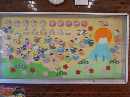 今月の玄関掲示は、2年生の担当です。2年生が作ったかわいい奴凧がたくさん空に上がっています。