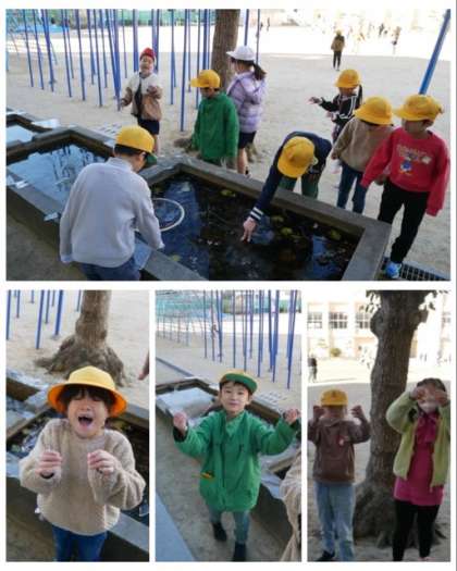 日本列島に寒波がやってきて、運動場にある池には、氷が張りました。