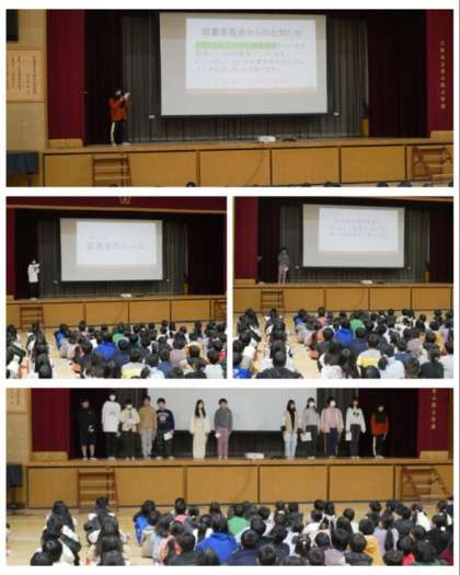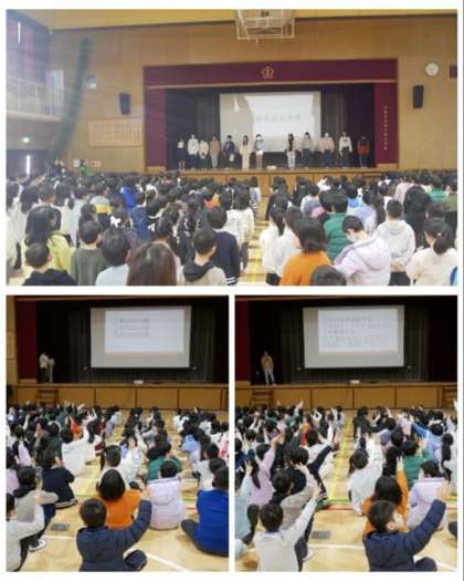 今日の児童集会は、図書委員会の発表でした。学校の図書館にある本の冊数や、開放回数などのクイズを出したり、図書館の使い方を紹介したりしました。