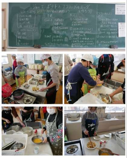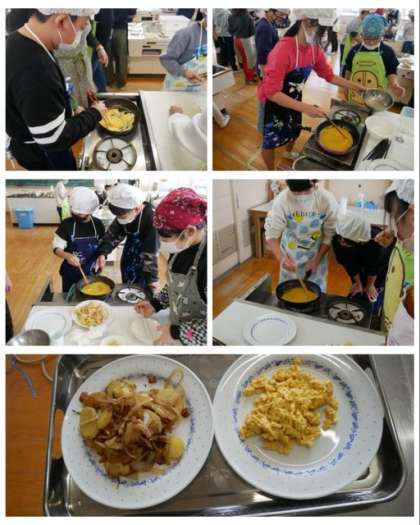 6年生は、家庭科の調理実習でジャーマンポテトとスクランブルエッグを作りました。