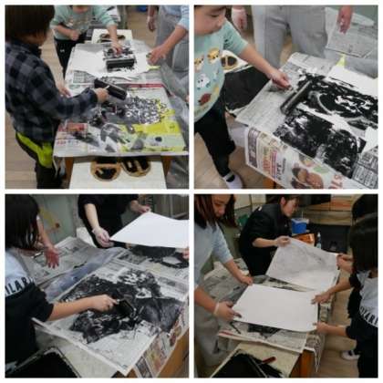 2年生は、図画工作科で制作した紙版画にインクをのせて印刷しました。刷り上がりを見る時のドキドキ感が伝わってきました。