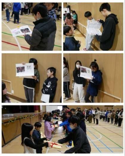 たてわり班の在校生から6年生へ感謝のメッセージをプレゼントを渡し、6年生からは各学級にぞうきんと、歌のプレゼントをし、和やかな雰囲気で祝う会を終えました。