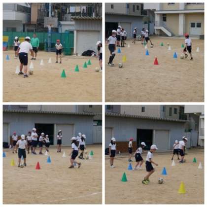 4年生は、体育科でボールを足で操作しながらコーンを素早く左右にドリブルできるようにがんばっていました。