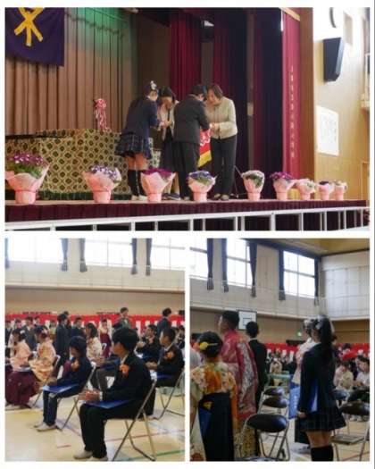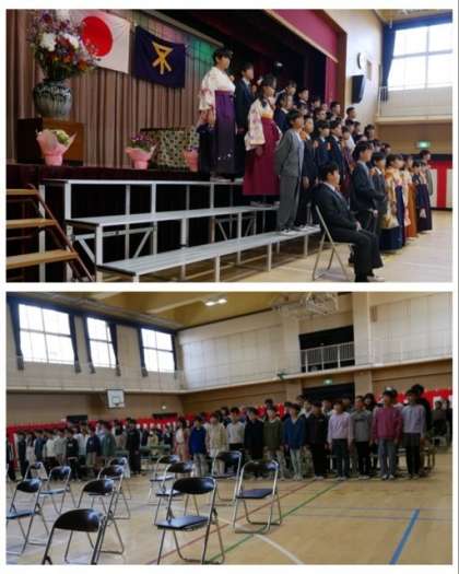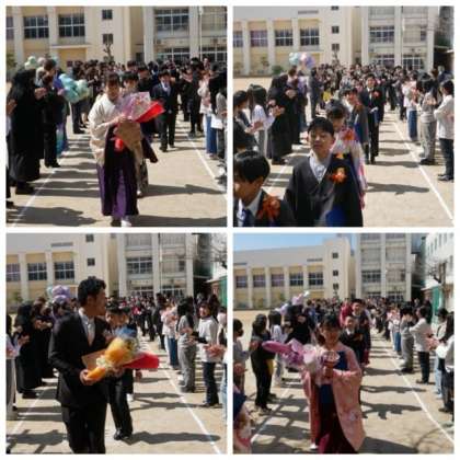 卒業式後、6年生は、保護者、5年生、教職員が作った花道を通って見送りました。