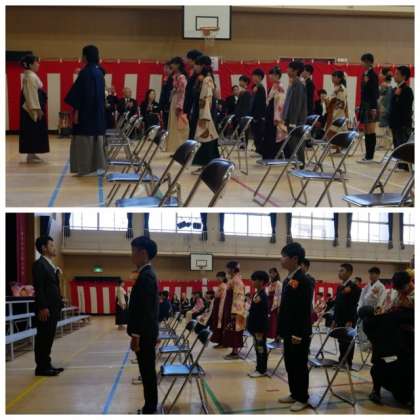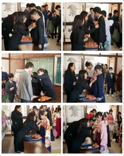 教職員から胸花を付けてもらい、39名の6年生は晴れやかな顔で卒業式に臨みました。盛大な拍手と5年生の威風堂々のリコーダー演奏で入場し、厳かな中にも温かい雰囲気の中で将来の夢を堂々と発表し、学校長より一人ひとり卒業証書を授与されました。