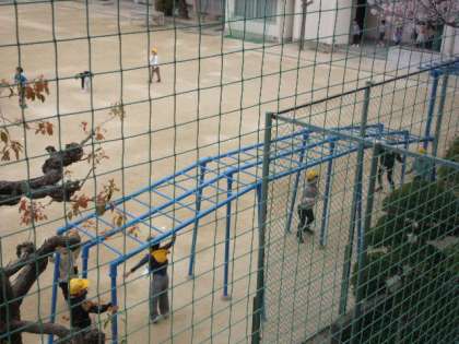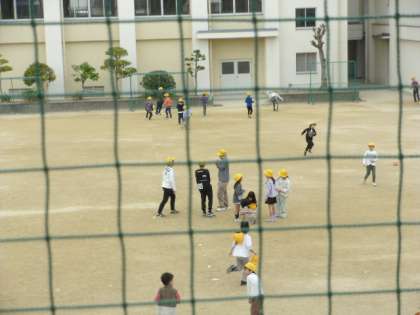 休み時間の様子です。休み時間のチャイムが鳴ると、運動場に走り出して、ドッジボールをしたり、バスケットゴールにシュートを放ったり、雲梯(うんてい)で遊んだり、肋木(ろくぼく)でおしゃべりしたりする姿が見られました。みんな元気です。