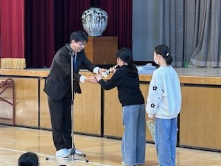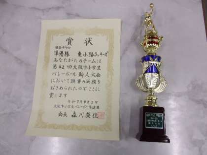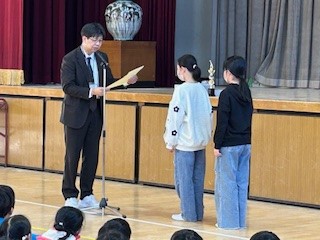 児童朝会では、東小路ラッキーズが表彰されました。第42回大阪市小学生バレーボール新人大会の混合Aブロックで、見事に準優勝となりました。トロフィーもいただきました。おめでとうございます。