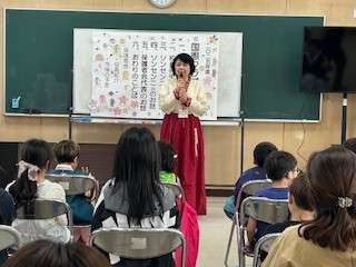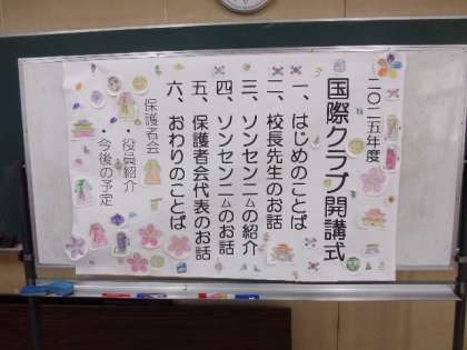 5月7日(水)14時50分より多目的室にて、今年度の国際クラブの開講式が行われました。はじめに、学校長のあいさつの後、ソンセンニムの紹介があり、ソンセンニムからあいさつがありました。