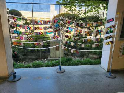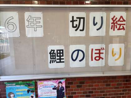 写真は、6年生による鯉のぼりの切り絵で、玄関付近に飾っています。また、1年生の教室の隣にある理科室の外に、毎朝、理科担当の先生が今日の天気やコメントなどを書いています。学校にお越しの際は、ご覧ください。