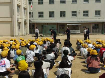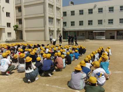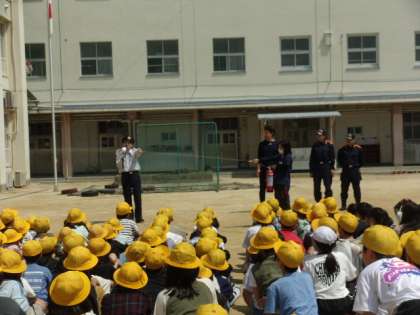 消火器の使い方を、本校の先生3名で実演。実際に使用しているのは、水消火器と呼ばれるものです。みんな、食い入るように見ています。