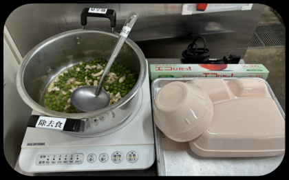 えんどうのたまごとじは、卵の除去食です。今年度から、アレルギー対応のために卵(鶏卵・うずら卵)と大豆(枝豆・豆乳)の除去食を提供しています。