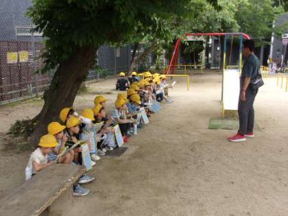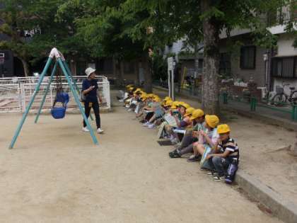 豆腐屋さん,八百屋さん,キムチ屋さん,靴屋さん,幼稚園,工務店などたくさん回りました。少し疲れたので、水分補給も兼ねて、公園で休憩を取りました。