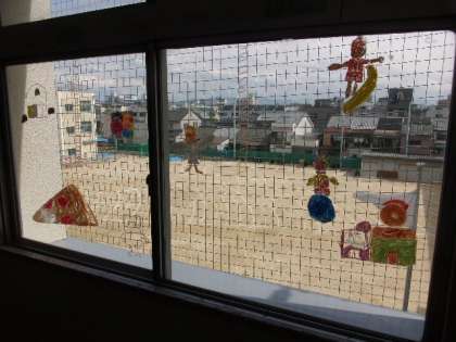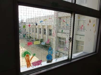 1時間では足りない感じですが、外の景色と融合した世界が完成しました。このパスは、窓に色を塗ることができるし、きれいに消すことができます。子どもたちは楽しく取り組みつつ、次の授業につなげるように今回の授業を振り返りました。