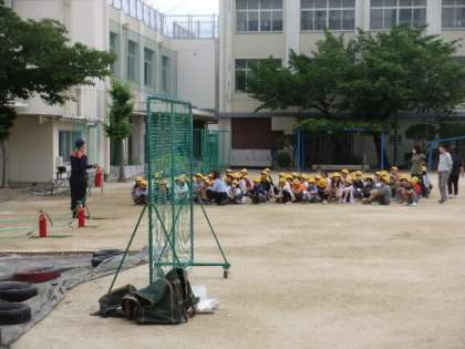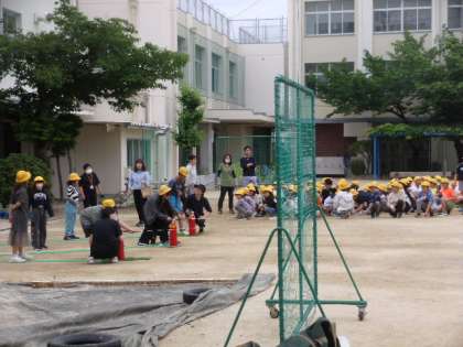 写真は、水消火器の使用の訓練の様子です。うまく、消せるかな?