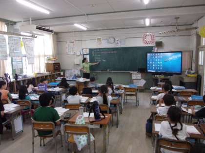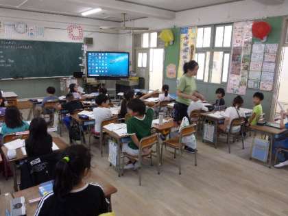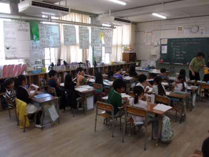 6月4日(水)の3時間目、2年生の算数の授業の授業の様子です。特製の20cmのものさしを使って、与えられた長さを動かして、読み取っています。