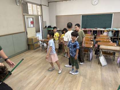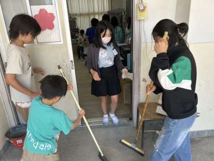 6年1組のみんなは班別に分かれて、清掃場所で、1年生に丁寧に、またわかりやすく、教えています。