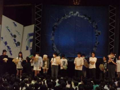 あさのあつこ原作の「いえでででんしゃ」という人形劇を、今回は公演していただきました。6年生も演じています。