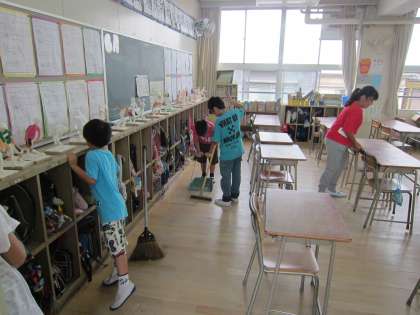 6月30日(金)本年度初めてのたてわり清掃を行いました。事前にたてわり班で話し合い、今日も朝の児童集会で各班ごとにめあてを決め、いよいよ本番です。子ども達は、計画通りに自分たちの分担場所を協力して一生懸命、清掃に取り組んでいました。