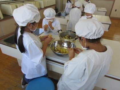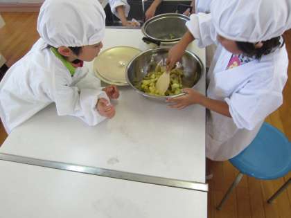 2年生が先日、学習園で育てたさつまいもを収穫しました。こどもたちは、収穫したさつまいもを使ってスイートポテトをつくりました。各グループで協力して楽しく調理することができました。