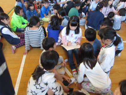 10月25日 今日の児童集会は、「音当てクイズ」をしました。講堂の舞台の幕の後ろでイベント委員が3種類の楽器で一斉に音を出し、その楽器の名前を当てるという内容です。子どもたちは、友だちと話し合って答えを考えていました。