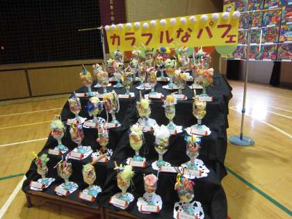写真は、1年生の作品「にらみねこ」と「カラフルなパフェ」です。